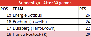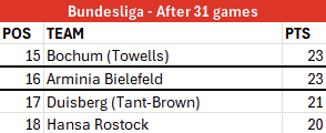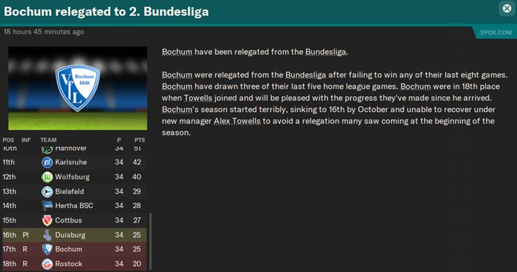 Perhaps it was for the best. Having been in a Champions League race all season, a run of five winless had seen Frankfurt fall to 8th, four points off the UEFA Cup positions. It was also for the best as Werder are a side I much prefer to Frankfurt in real-life. Woodward had three games to play out to end the season with nothing to play for. The same was not true for the other two managers. The first game in May was Towell’s Bochum vs Tant-Brown’s Duisburg in a real relegation six-pointer.