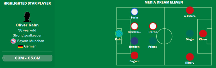 The dream eleven is both a great trip down memory lane and a good tool to highlight where we are starting. A 38-year-old Oliver Kahn enters the save after 13 years in the Bayern goal and remains the top goalkeeper in the league. He’s joined by fellow Bayern stars Willy Sagnol, Zé Roberto, new Bayern signing Franck Ribéry, and Miroslav Klose. Werder Bremen, coming off a 3rd placed finish the season before have the great Torsten Frings and greater Diego in the dream eleven, and champions Stuttgart have two players of their own in Fernando Meira and Pável Pardo.