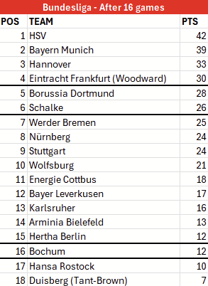 Tant-Brown would need 15 attempts to win his first game in the Bundesliga, but his Duisburg side finally managed to claim all three points as they won 2-0 at home to Bochum. The same weekend, Alex Towells was sacked as Hertha Berlin manager. Whilst I had focused on Duisburg’s struggles to win a game, Hertha had nosedived following a good start to the season. That 2-2 draw against Duisburg back in September was the first of eleven winless in the Bundesliga. In a way, Tant-Brown had sacked Towells again. He was close to getting the Schalke job, but Louis van Gaal had gotten in before Hertha dismissed Towells. Instead, he would have to wait for 2008 until he could get a new role.
